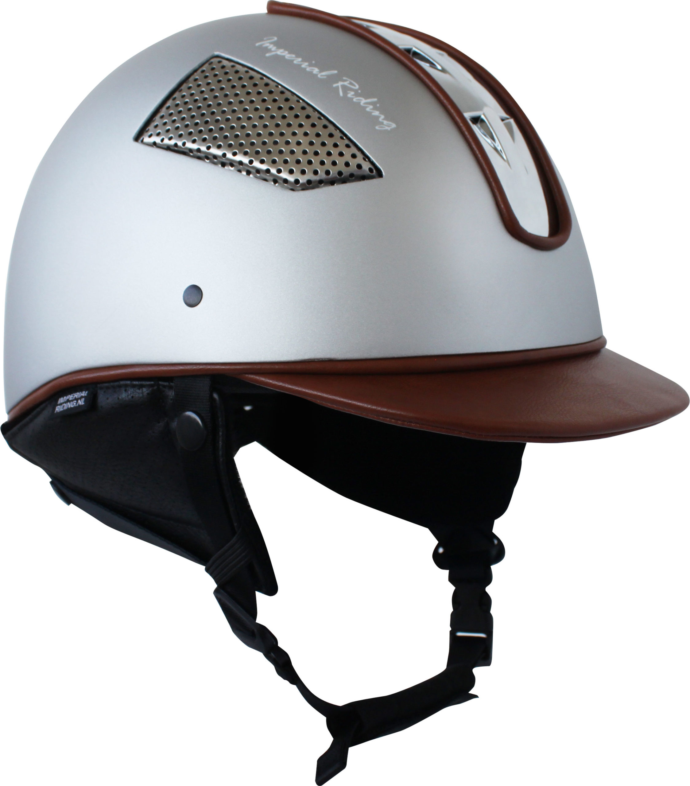 Verstelbare rijhelm in zilverkleur met cognackleurige details. Met ventilatieroosters in metallic kleur. Losse oorwarmers leverbaar die je aan de helm kan bevestigen voor de koude winterdagen. S (53-56) M (57-59) L (60-61)