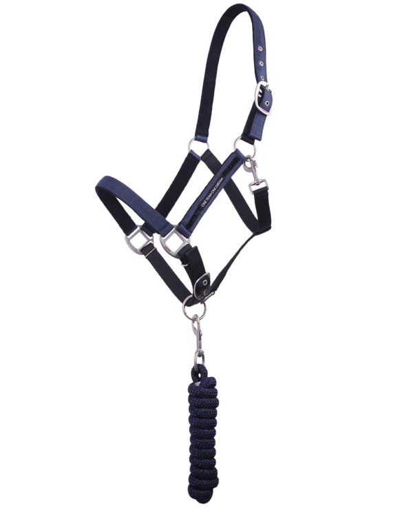 Luxe halsterset met een lichte metallic glans over de gekleurde stof.Specificaties: Materiaal: Polyester, Polypropyleen; Materiaal fournituren: Ijzer; Luxe halsterset met een lichte metallic glans over de gekleurde stof; Voorzien van luxe gesatineerde fournituren met QHP gravering; Gedecoreerd met glittertape op beide bakstukken; Het linkerbakstuk bevat een “One Team, One Dream”-badge; Het kopstuk en de neusriem zijn verstelbaar; Met bijpassend halstertouw met musketonsluiting; Voorzien van een zachte suedine voering onder de neusriem, bakstukken en het kopstuk.
